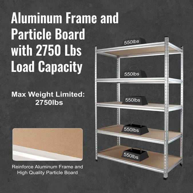 Направљен од висококвалитетног оквира од легуре алуминијума и иверице, овај регал је стабилнији и издржљивији од нормалних гаражних полица. максимални капацитет је до 2750 лбс укупно, 550 лбс по полици, која може да ускладишти много више ствари и алата у вашој гаражи или складишту.висина сваког слоја може бити већа. одабрани и прилагођени вашим потребама. постоје две опције приликом склапања. један је да се направи целина од 5 нивоа - 48" ш к 24" д к 72" х. друга се може поделити на 2 одвојене полице као појединачна јединица - 3-слојне полице са 36" висине и 2-слојне полице са 38" висином .комплет укључује: 10 ком дуге греде10 ком кратка греда4 ком доњи стуб4 ком горњи стуб5 ком дрвена полица4 ком доњи заштитни рукав4 ком поклопца за главутип полице: иверицадимензије производа: 24"д к 48"в к 72"хматеријал: алуминијумброј полица: 5-слојни регалитип инсталације: самостојећи Димензије производа: 24 к 48 к 72 инчаоквир од алуминијумске легуреотпорна на корозију и рђу, полица од легуре алуминијума за тешке услове рада. премиум иверица2750лбс укупно550лбс по полицинеклизајућа простиркаштити под , додајте додатну стабилност и избегавајте случајно клизање полица